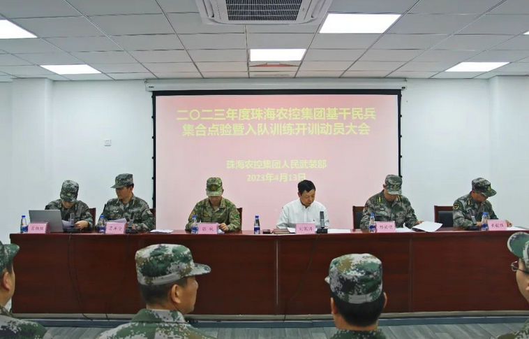 4月13日上午,农控集团召开基干民兵集合点验暨入队训练开训动员大会。珠海警备区战备建设处参谋张斌、市直属单位人民武装部副部长邹兴明到会指导,受集团党委书记、董事长、武装部部长张凡委托,集团党委副书记刘国涛、武装部副部长黄毅锋出席大会。