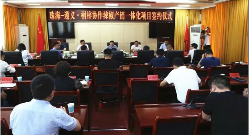 近日,“珠海-遵义· 桐梓协作辣椒产销一体化项目”签约仪式在桐梓县政府举行。桐梓县人民政府、珠海市菜篮子投资有限公司、辣妹子食品股份有限公司、遵义辣椒产业集团有限公司签订了四方合作协议,共同打造辣椒产销一体化产业。彩神网站网页版集团党委副书记刘国涛同志出席签约仪式。