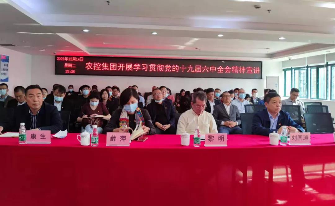 为深入学习贯彻党的十九届六中全会精神,深入领会全会精神内涵,2021年12月14日下午,农控集团党委邀请市委宣讲团成员曾本伟同志进行了学习贯彻党的十九届六中全会精神宣讲。市委党史学习教育第十四巡回指导组、集团领导班子成员、各二级企业班子成员、各基层党支部书记、党务工作者、党员代表等80余人参加会议。会议由集团党委副书记刘国涛同志主持。